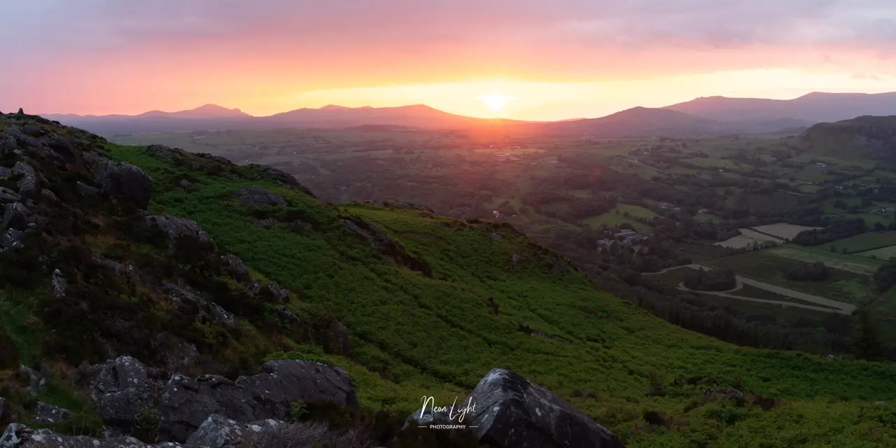 The route begins from a large layby on the A497 just outside Criccieth, following a gentle track through farmland before climbing steeply towards the summit. From the top you’ll see the dramatic triangular peak of Cnicht, the ridges of Moelwyn Mawr, and on a clear day, Yr Wyddfa (Snowdon) in the distance. To the west lies the full curve of Cardigan Bay, glowing gold at sunset.